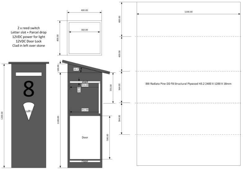 To address the parcel delivery issues and replace the old falling apart letterbox I had come accross a youtube video of a parcel drop box that suited my situation, I could modify it to have a side opening door instead of front opening add a letter slot. Then because you can why no make it smart so it tells me when a letter is delivered or a parcel is placed inside.